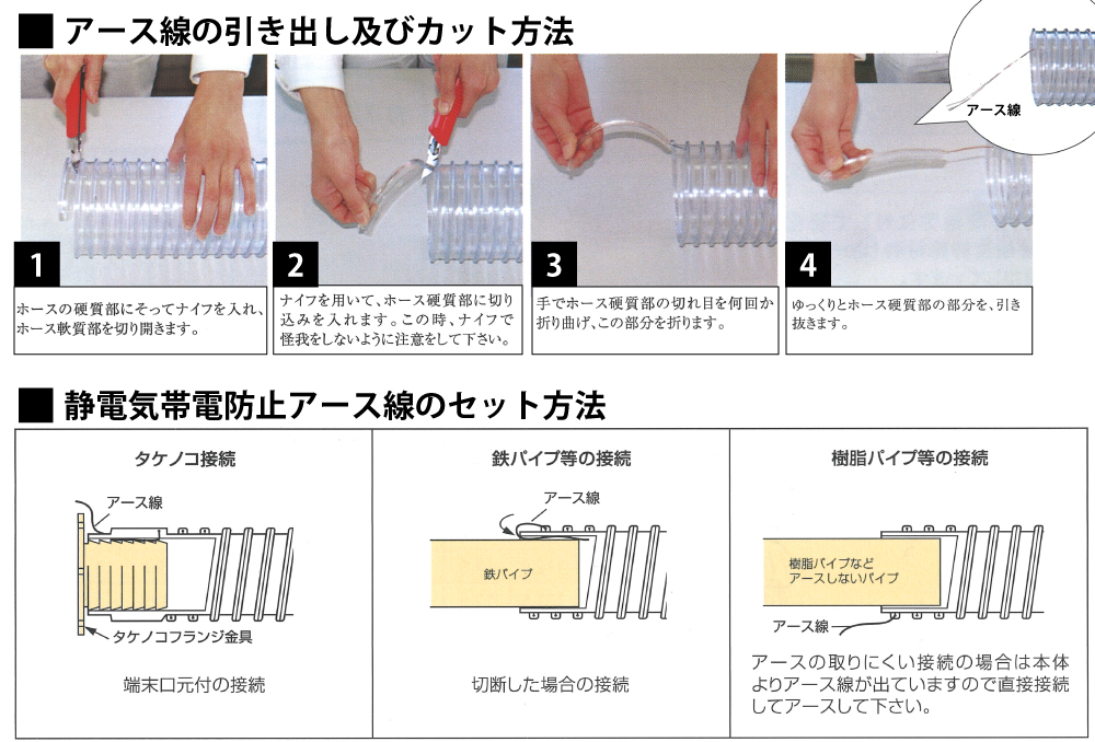 ●ホース硬質部にアース線を通してありますので、このアース線を利用してアースを取ることができます。