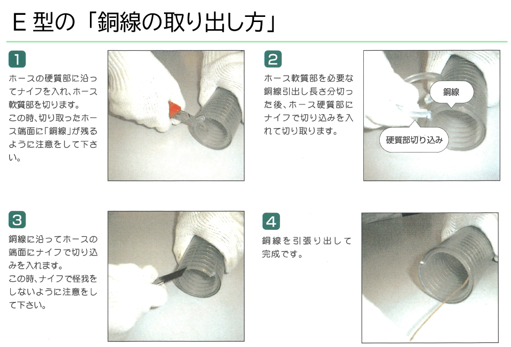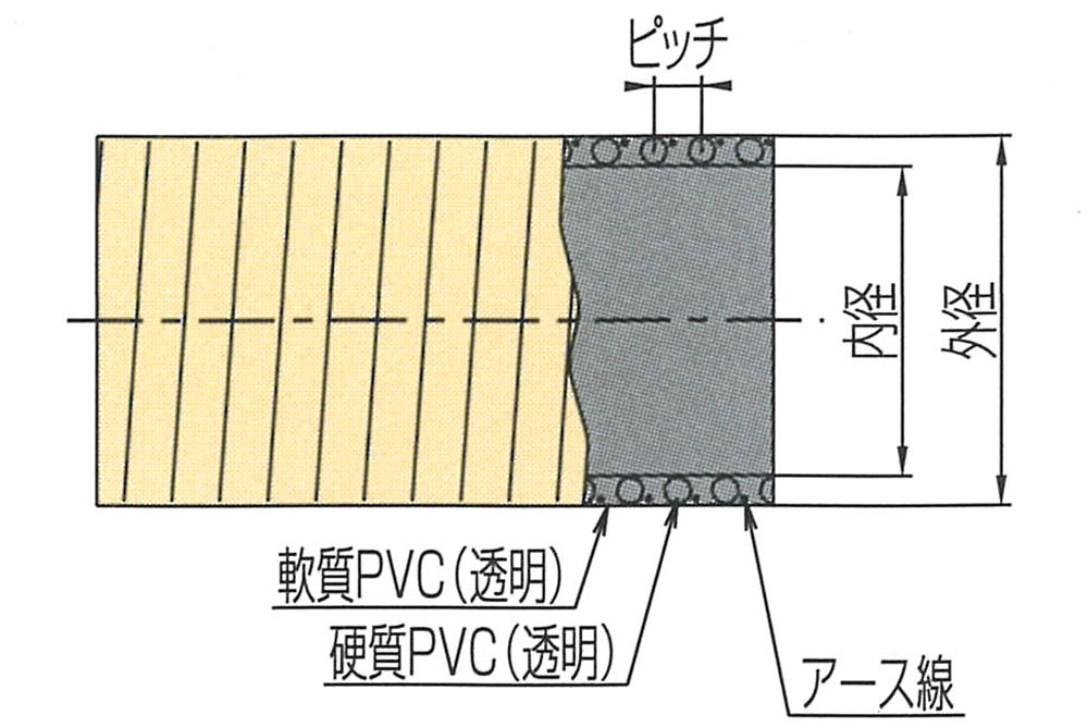 ※ご使用期間中に内面摩耗によりアース線が露出しますとアース線の破片が輸送物に混入します。 内面摩耗に十分ご注意の上、事前に新しいホースと交換して下さい。