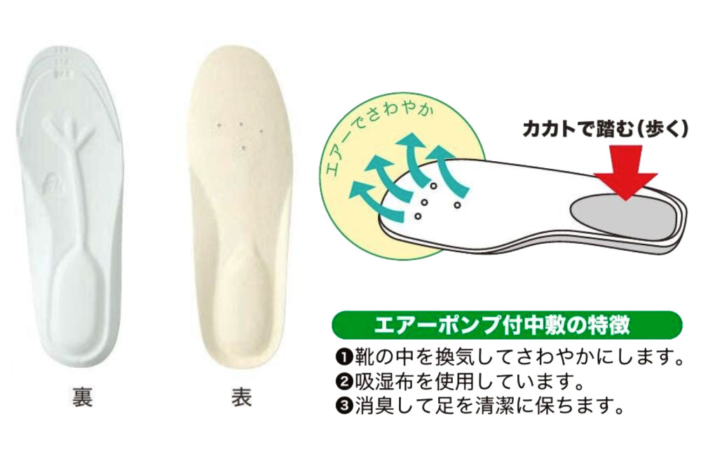●中敷の踵部を踏むことでつま先に空気が循環し靴の中を換気してさわやかにします。
