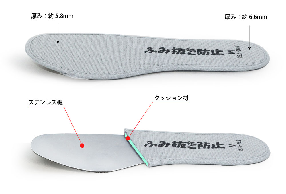 釘、ガラス、突起物などから足裏を守るステンレス板入りの中敷きです。