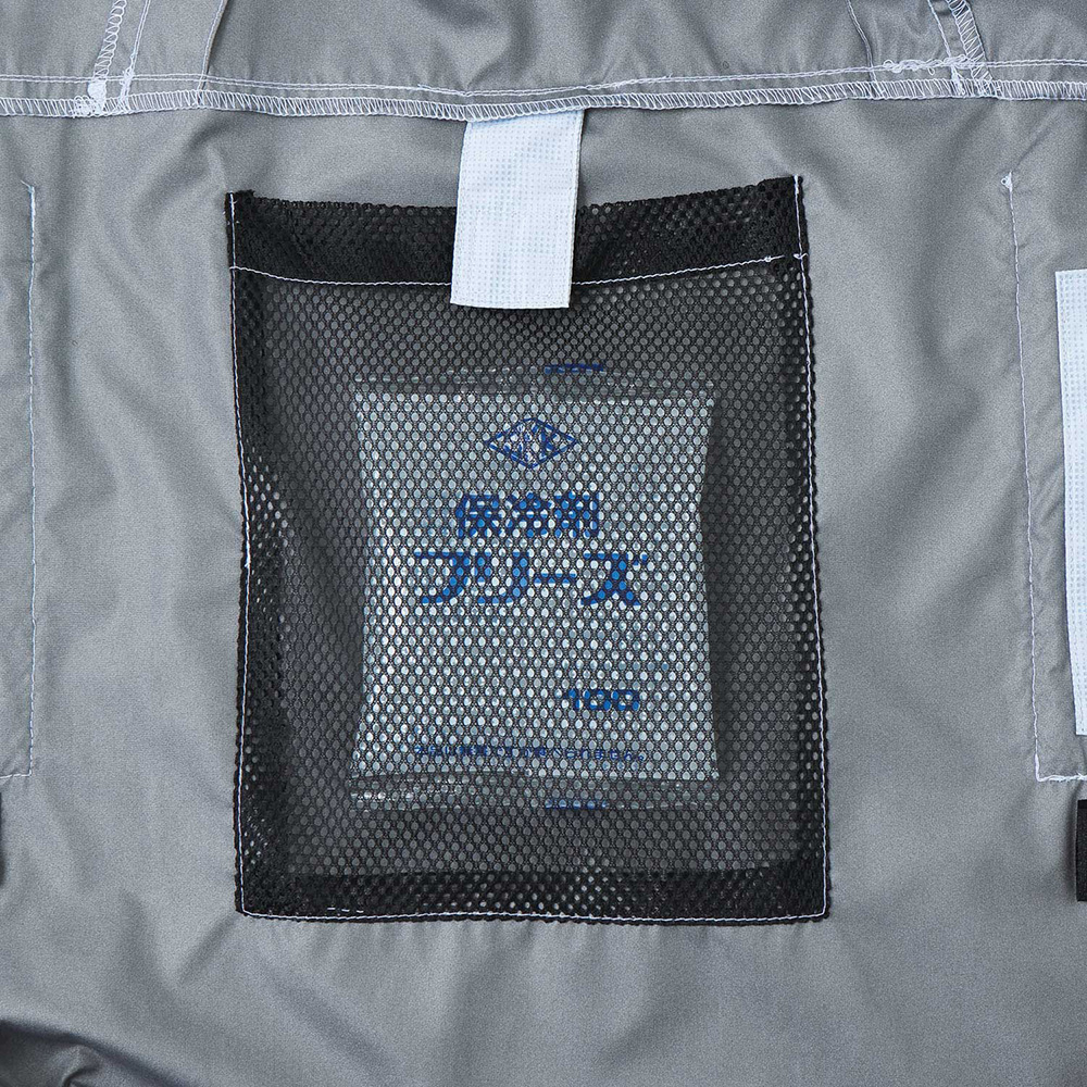 ・ファン取り付け部には、脱落防止のネットを付けています。風神ベストとの併用で、フルハーネス装着での高所作業でも衣服内を快適に保つことが可能です。