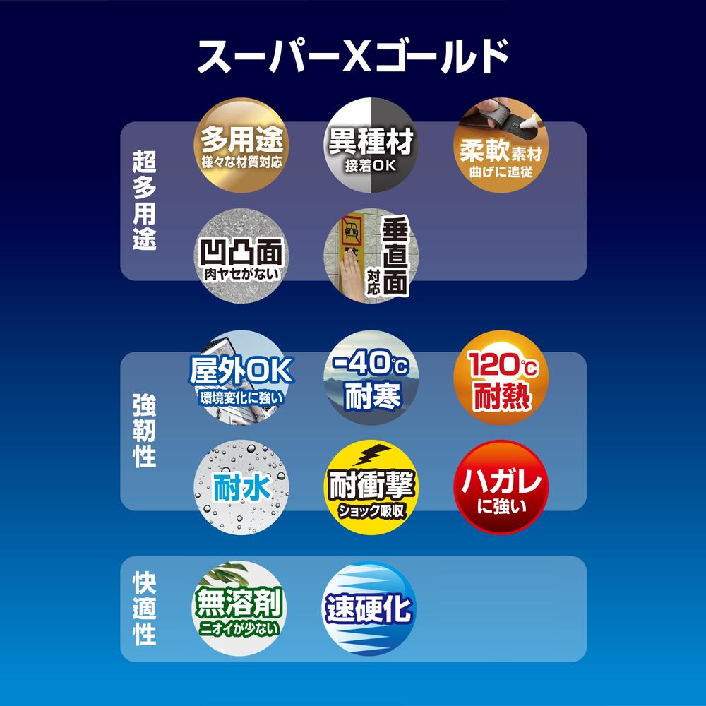 ●対応物質:金属、プラスチック、ゴム、無機材料、天然素材(※ポリエチレン・ポリプロピレン・フッ素樹脂・ポリアセタールなどには接着しません。)