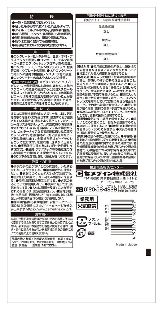 ●外装多用途。木材、硬質プラスチック、金属、タイル等の接着※ポリエチレン、ポリプロピレンは除く。