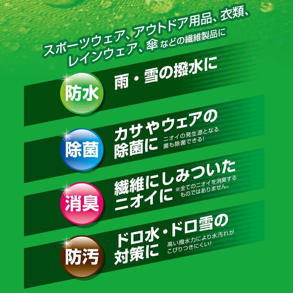●スポーツウェア、アウトドア用品、衣類、レインウェア、傘等の繊維製品の防水・除菌・消臭・防汚。雨濡れするベランダ・庭・屋上のファブリック等の防水・除菌・消臭・防汚。