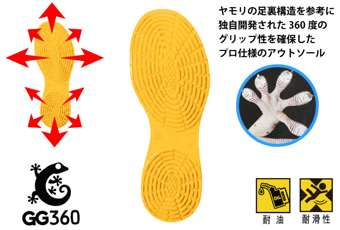 ●ヤモリの足裏構造を参考に独自開発したソールで360度のグリップ性を確保。