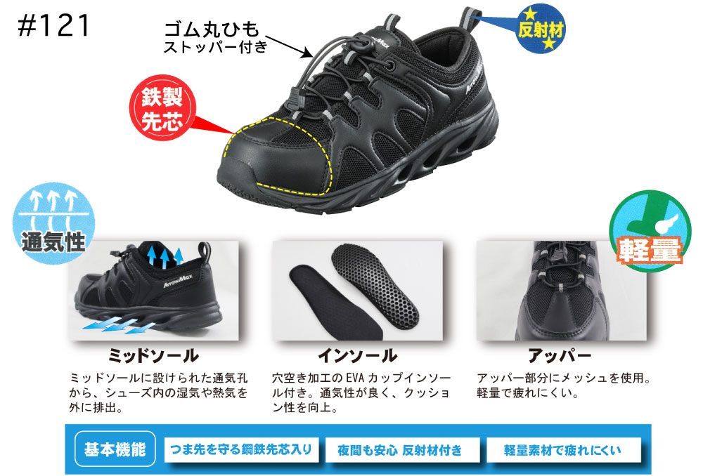 ●アッパー材質:PU/メッシュ/反射テープ(靴ひも:ゴム丸紐)