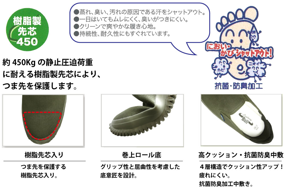 静止圧450Kgに耐える樹脂先芯入りセーフティシューズ