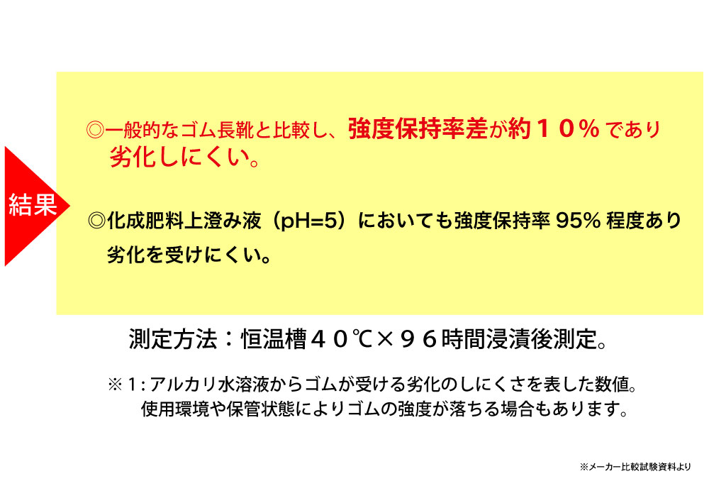 ※一般的なゴム長靴と比較し、強度保持率差が約10%であり劣化を受けにくい。(メーカー試験資料より)
