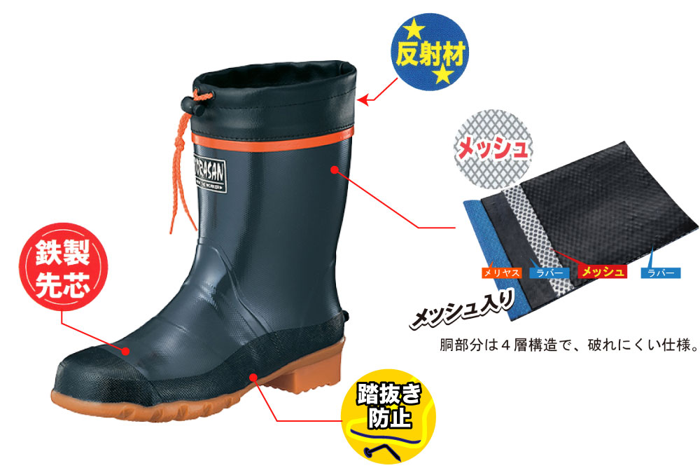 つま先鉄製先芯入り、ステンレス製踏み抜き防止で安全!作業用長靴