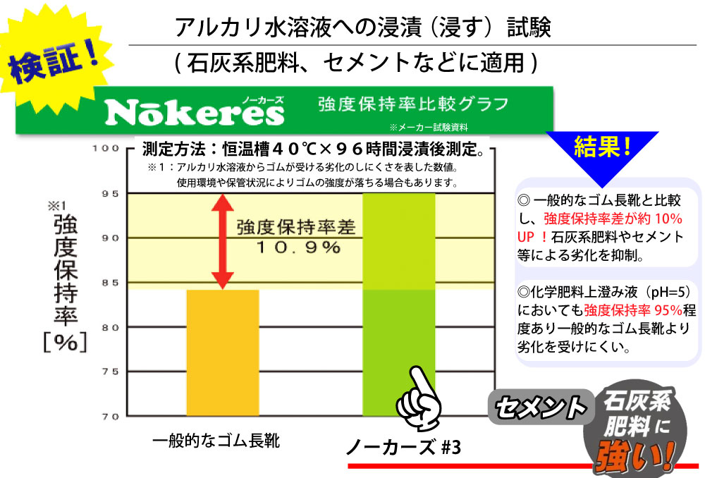 ●ノーカーズ#3は一般的なゴム長靴と比較し、強度保持率差が約10%UP!石灰系肥料やセメント等による劣化を抑制。