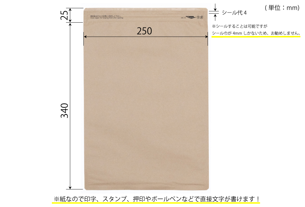 チャック上 + チャック下 x 袋巾(mm):25 + 340 x 250