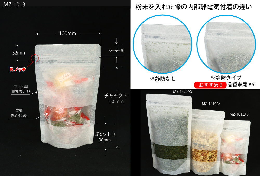 ●和紙の様な外観を持ちながら、高いガスバリア性と防湿性に優れるスタンドタイプのチャック付き袋。