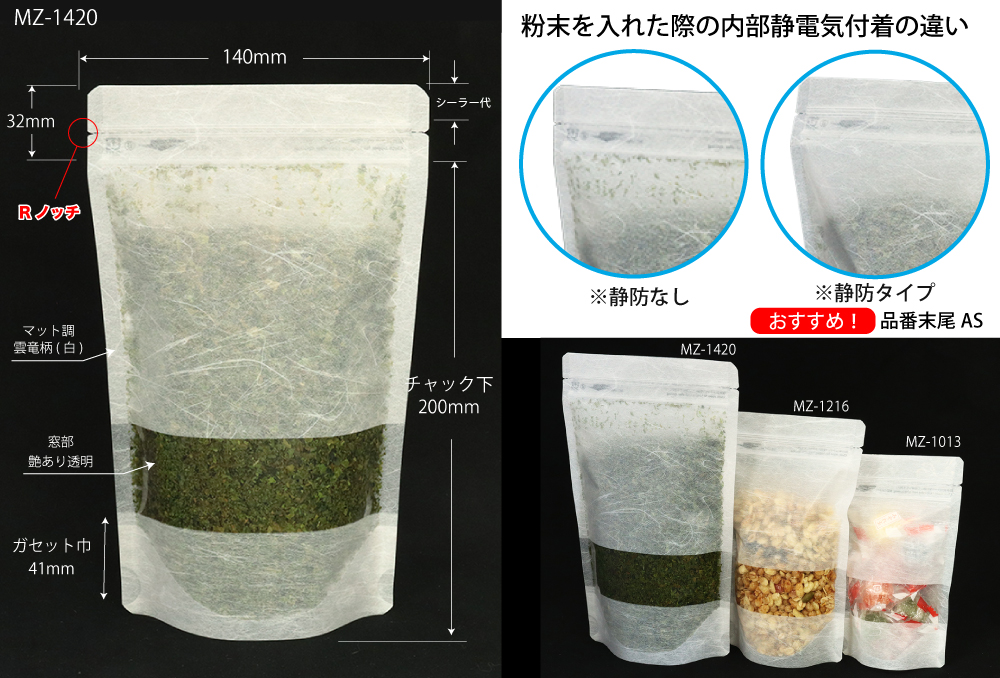●和紙の様な外観を持ちながら、高いガスバリア性と防湿性に優れるスタンドタイプのチャック付き袋。