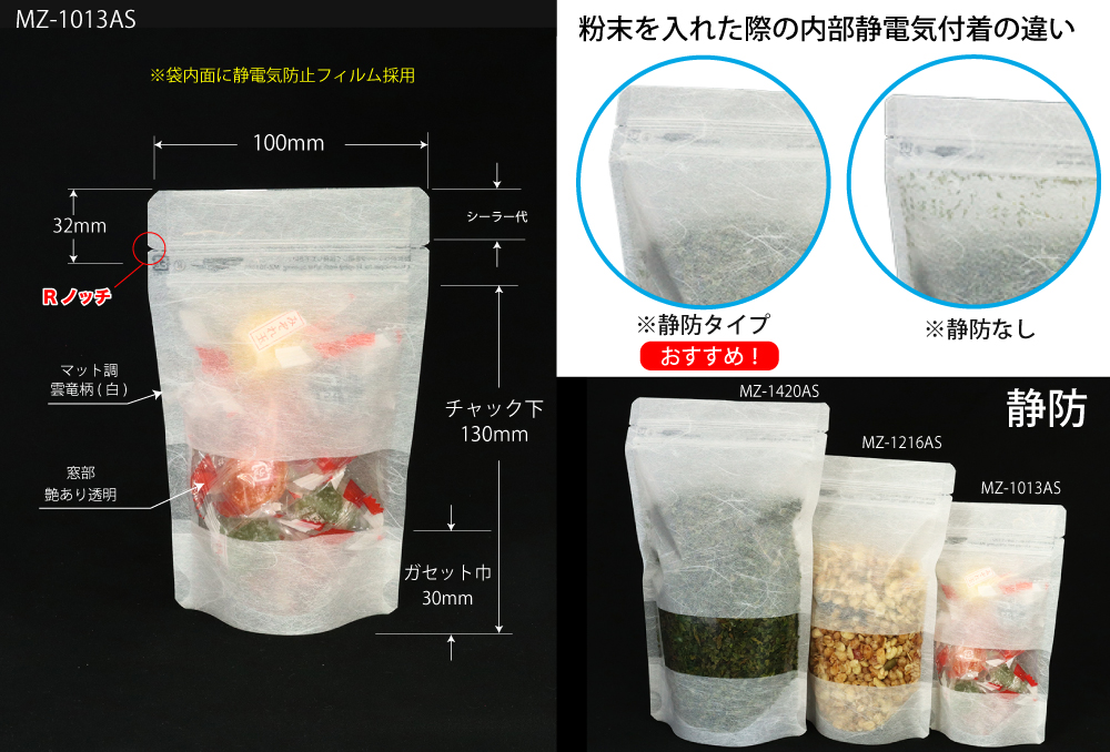 ●和紙のような見た目を持ちながら、高いバリア性と静電気による粉体などの内面へ付着を抑制する静防タイプのチャック付き袋。