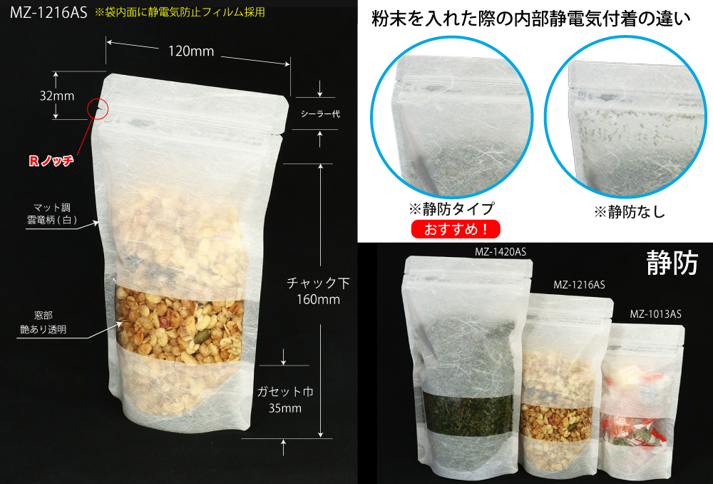 ●和紙のような見た目を持ちながら、高いバリア性と静電気による粉体などの内面へ付着を抑制する静防タイプのチャック付き袋。