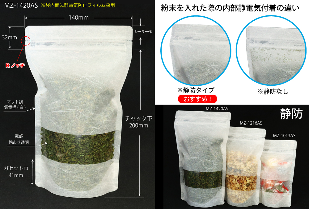 ●和紙のような見た目を持ちながら、高いバリア性と静電気による粉体などの内面へ付着を抑制する静防タイプのチャック付き袋。