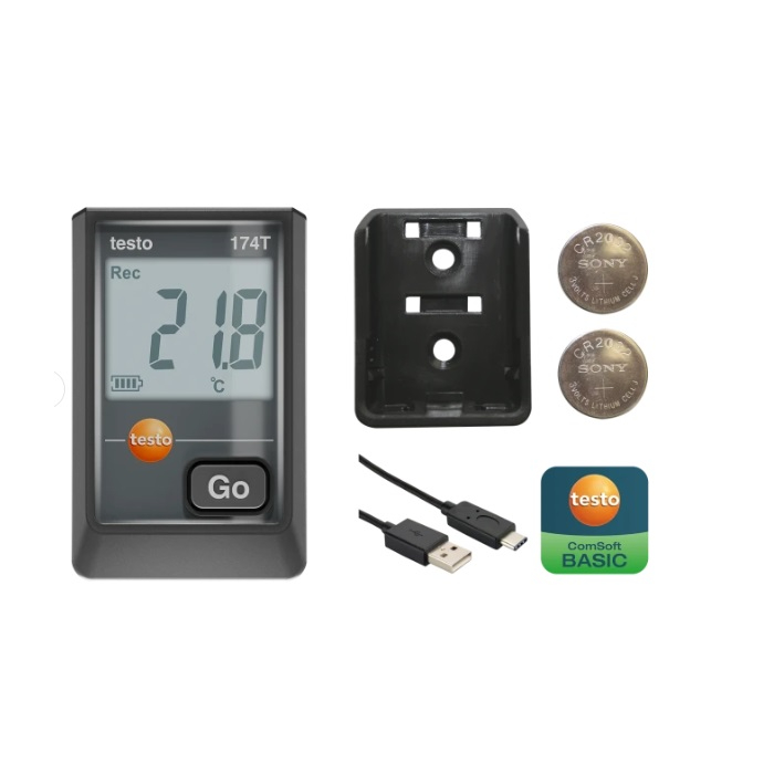 ●同梱品:testo 174 T (黒) ×1、壁掛けホルダー×1、CR2032リチウム電池×2、USB 2.0 タイプC ⇔ タイプA ケーブル (0.2m) ×1、出荷検査書×1