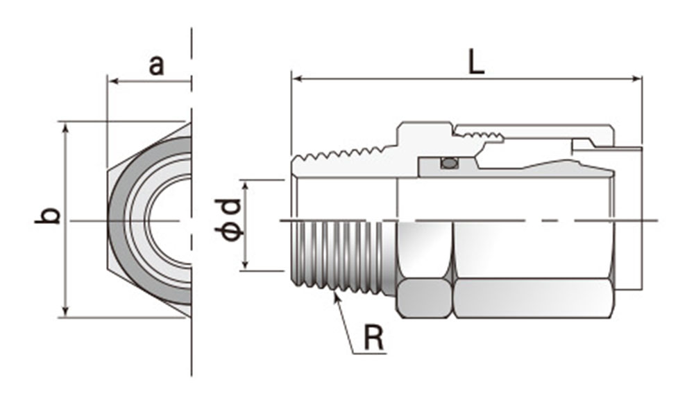 十川産業のMEGAホース専用(ホース内径6mm,Rネジ1/4インチ)ステンレス継手です。