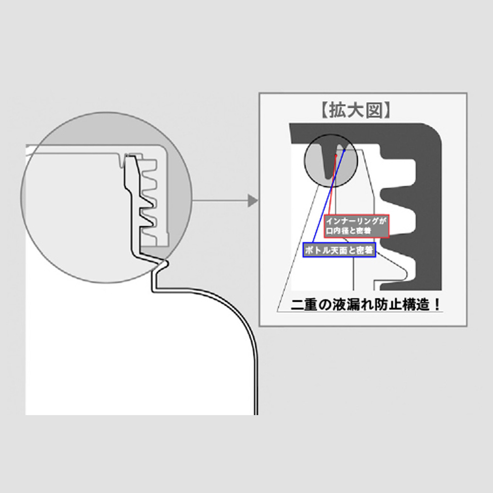 ●ボトル口内部とインナーリングが密着して液漏れを防止。